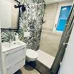 A fürdőszobához tartozik zuhanyzó és mosdókagyló.